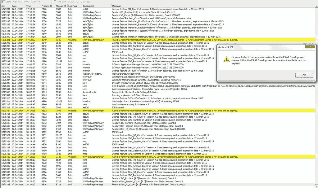 При разработке системы в момент запуска в runtime режим появилось окно об отсутствии лицензий. До этого все прекрасно работало пару недель. Закрыл окно, посмотрел в licence manager - пропали файлы лицензий... установил с диска заново... - IDE перестал запускаться, не видит лицензии.
