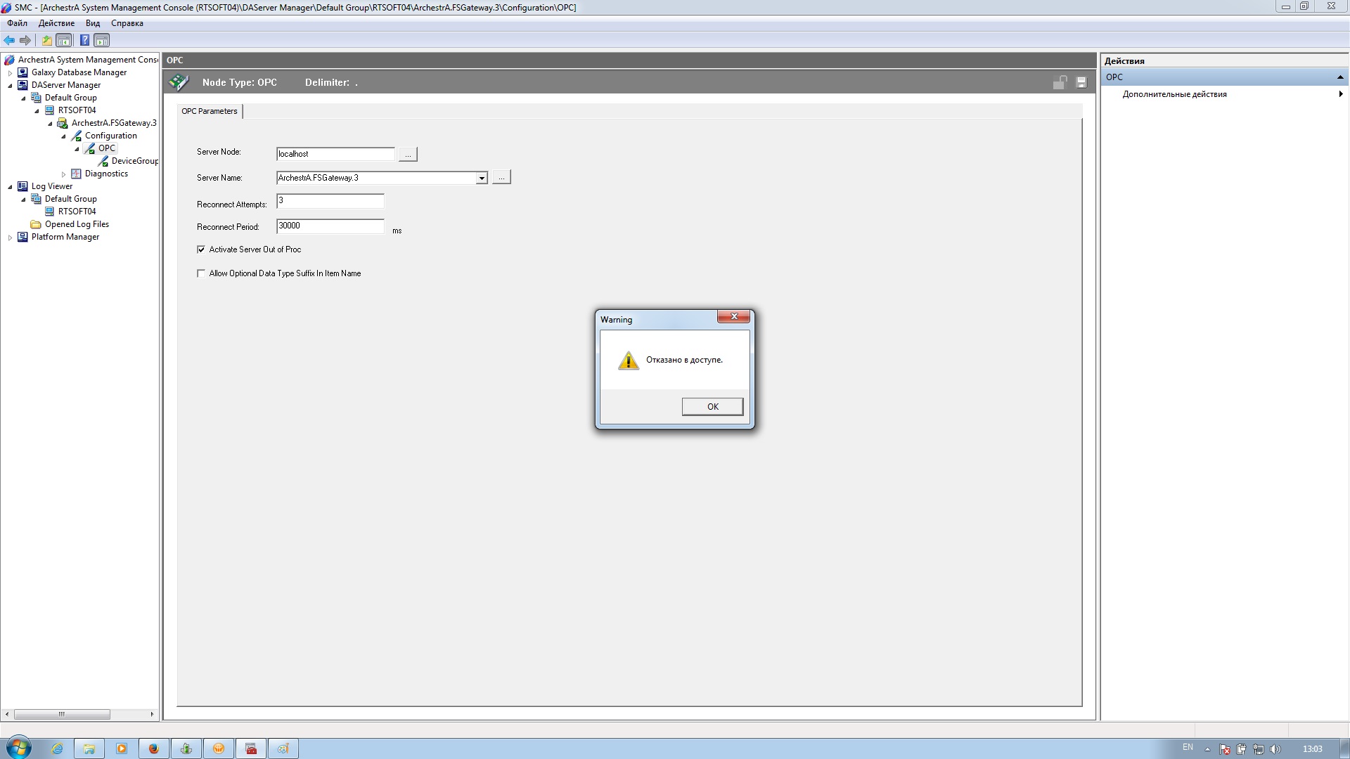 Установил fsgateway, но вот ваще не работал выбор opc серверов. Просто в дереве узел localhost, а в узле пусто. Не было ни настроек, ни конфигураций, ничего. А учетная запись моя админская на кириллице. Решил в утилите change network account поменять текущую запись пользователя и создать заодно учетку латиницей. После перезагрузки появился выбор зарегестрированных opc серверов. Но вот только теперь выбрать дает, а сохранить нет. "Отказано в доступе" пишет. Где еще чего сломать надо? Прикладываю скрины.