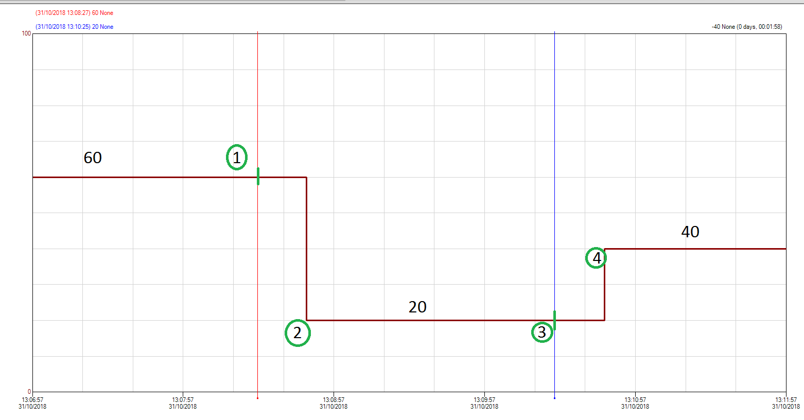 Также в моментах (1) и (3) я подавал задание 20 и 40 как выше описано. Причем, после последней полученной точки(4), тренд строит прямую, и если через минуту, час, день записать в тег значение = 20, то с точки (4) пойдет линия до 20 и закончится она с меткой времени, когда записали в тег(через минуту,час,день) ПЛЮС двадцать секунд.
