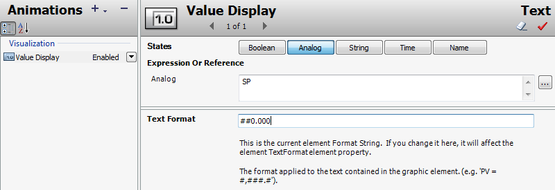 Все так, пересоздал текстовый объект в Value Display указал Text(me.SP, "#0.000") в State выбрал в этот раз String