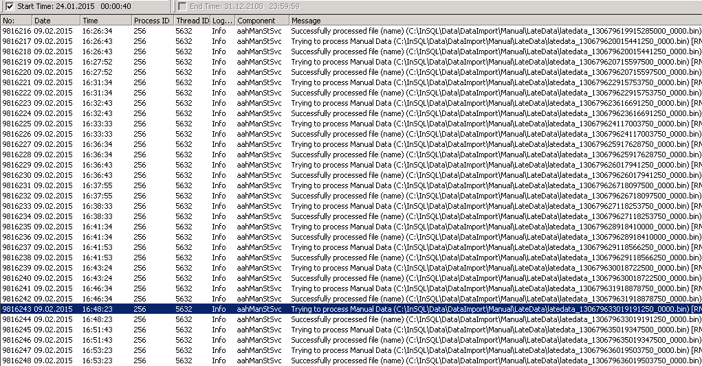 Переключил импорт данных не через csv, а напрямую запись в БД. Вижу что данные поступают. В наличии три InSQL сервера для разных объектов, так вот на двух судя по логам идет обработка файлов из папки LateData, а на третьем сервере таких записет нет. Судя по трендам данные поступают везде. Возник вопрос, почему так?