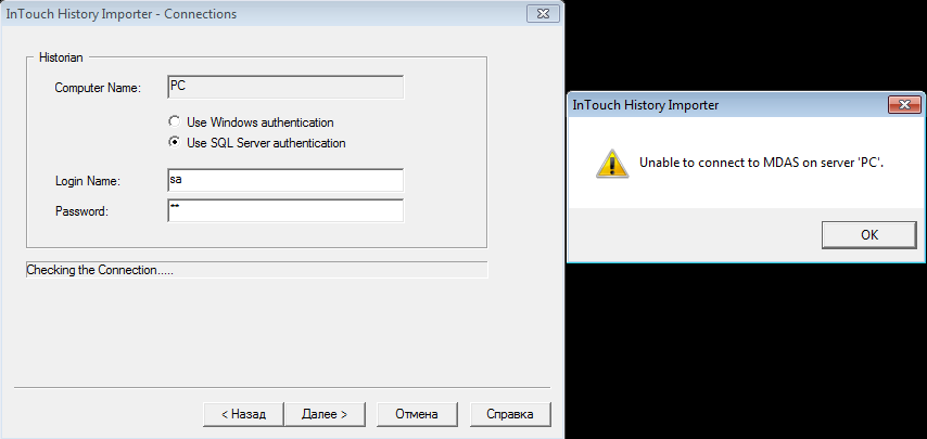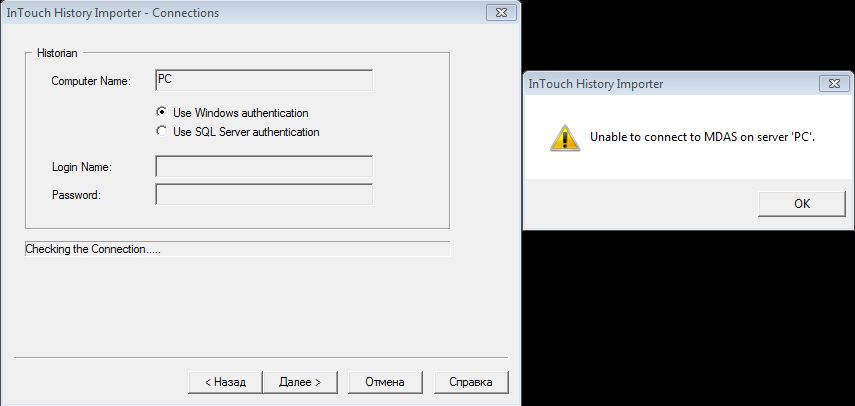 Подскажите пожайлуста, в чем может быть проблема. Необходимо получить историческе и оперативные данные с InTouch в Historian (они установлены на разных машинах). Но при запуске утилиты InTouch History Importer выдается ошибка: "Unable to connect to MDAS on server 'PC' ".