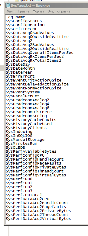 Во вложении (IODriver.PNG) данные из sql таблицы IODriver. В данном случае, идентификационный номер N - IODriverKey - это 2, ключ моего ОДНОГО и ЕДИНСТВЕННОГО idas (см. предыдущее вложение idas.png). Во вложении systags.png системные теги хисториана. Там есть только SysDataAcqRxItemsPerSec2, а других конечно нет, так как idas один у меня, в котором восемь источников данных. Помогите мне постичь истину! Какие теги и где их взять (я так уже понимаю, что нигде), чтобы у меня были значения по КАЖДОМУ из ВОСЬМИ серверов из моего одного idas?
