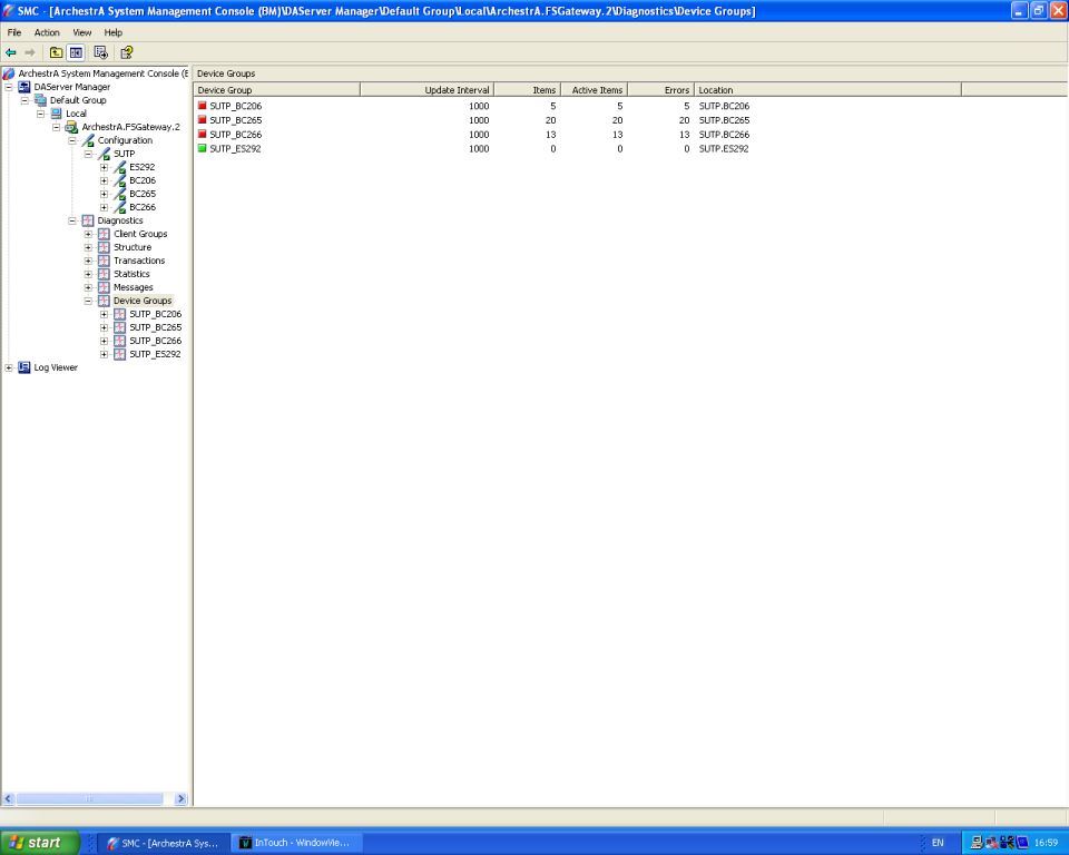 Здравствуйте, настроил на компьютере OPC siemens через обычную сетевую карту, данные забираются с CPU-416. После настроил DAServer, сконфигурировал его с OPC. Запустил проект InTouch, в DAServere через диагностику видно что данные кое какие иногда поступают, Device Groups почти всегда зелёные, когда становятся активными Items Groups, то Device Groups становятся красными но и сами блоки (DB c контроллера) передаются очень слабо в красном статусе а если в зеленом то в них в этот момент пишется (W) но не читается (R). Так же сами группы гораздо больше по объёму чем то что отображается. Было ли у кого подобное? Скрины прилагаю