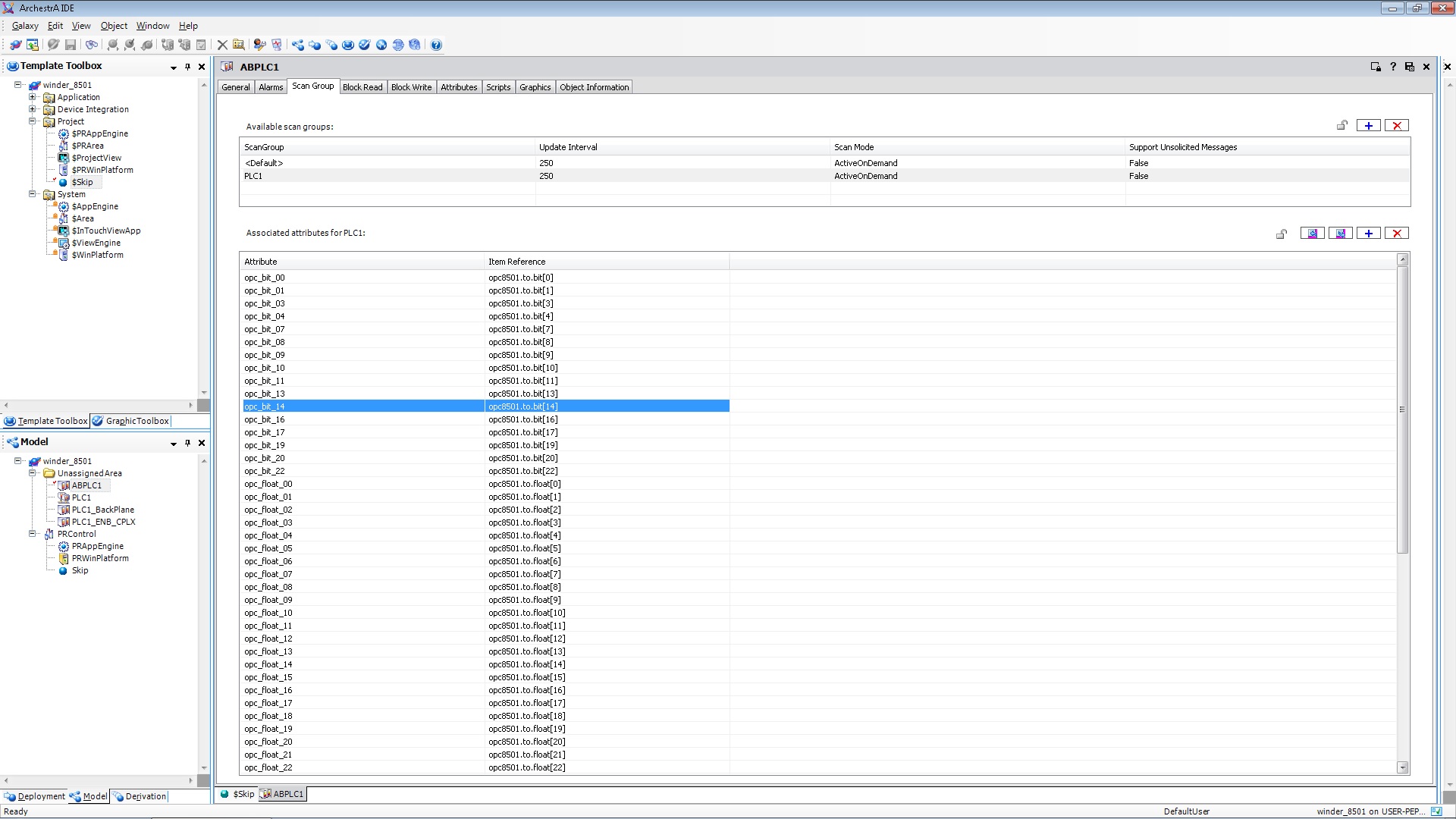 Проект разрабатывается в Wonderware System Platform 2014 R2. Для связи с контроллерами фирмы Rockwell используются DIObject. В проекте используется пока только один контроллер.