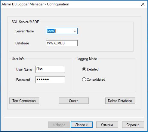 Alarm DB Logger Manager создал базу wwAlmDB.