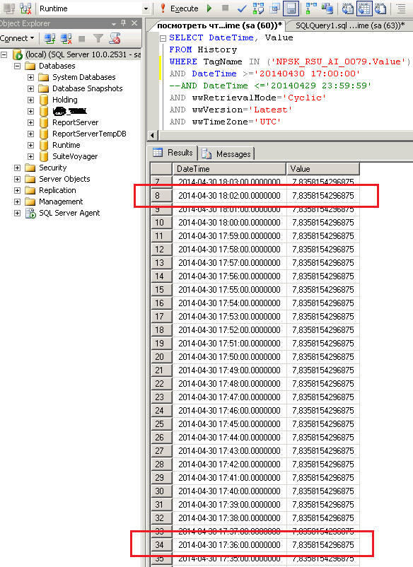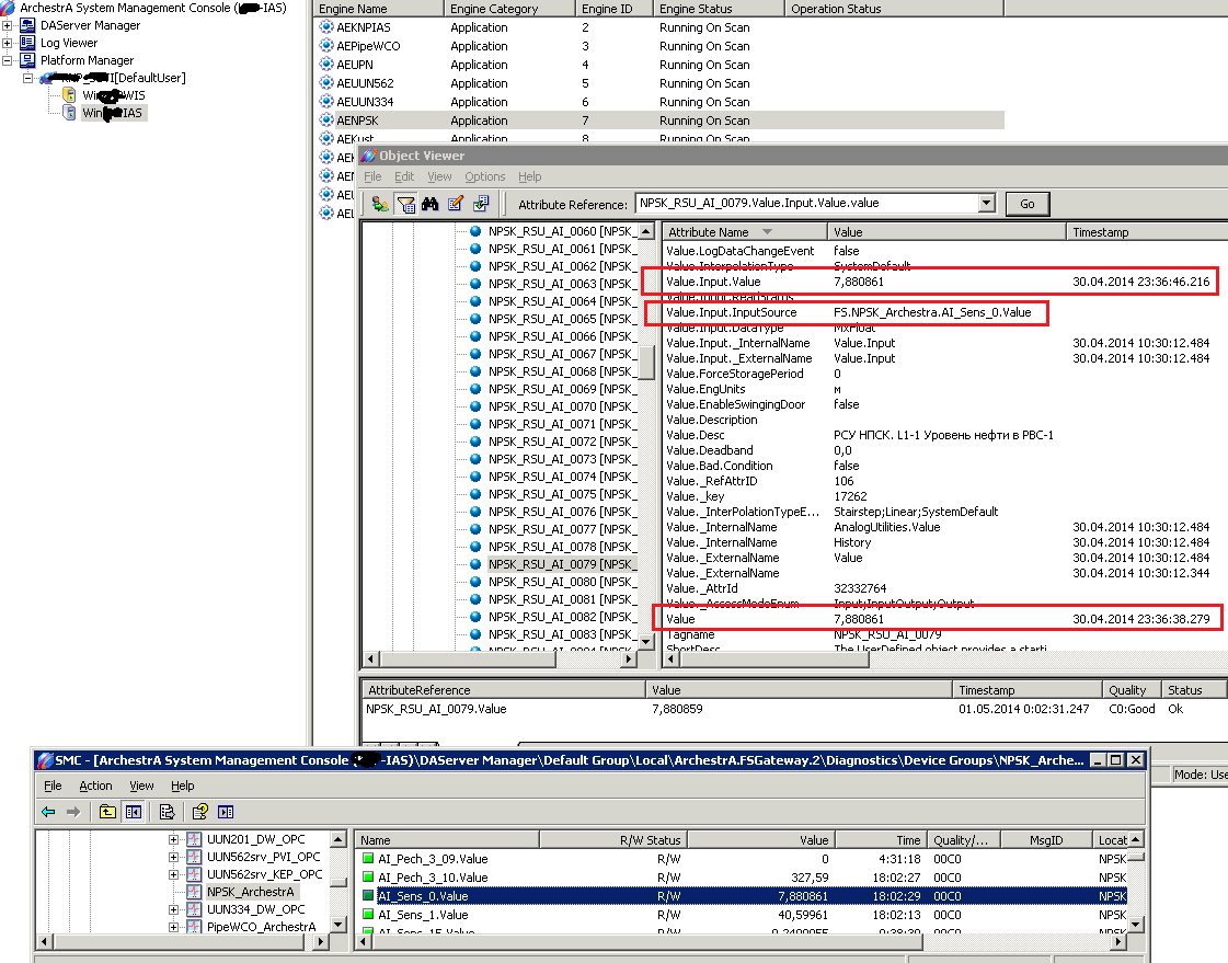 При обращении к БД Runtime для любого тэга из MDAS получаю постоянное значение. Значения получаю через подключения в FSGateWay. Если смотреть в SMC/DAServer Manager/.../Diagnostics, то значения всех тэгов динамически меняются. Менются они и в Object Viewer'е определённого Engin'а, который можно видеть в Platform Manager'е. Но в выборке из БД я получаю таблицу с постоянным значением для текущей метки времени.