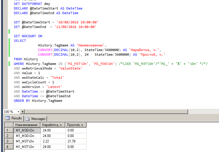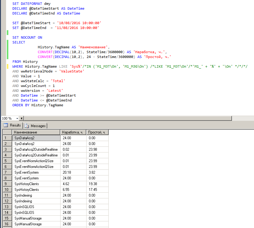 SELECT TagName AS 'Наименование', CONVERT(DECIMAL(10,2), StateTime/3600000) AS 'Наработка, ч.'
